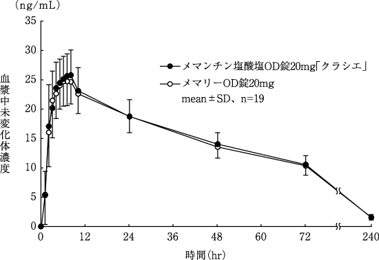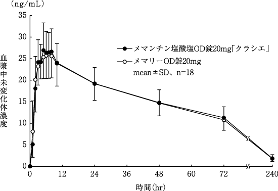 健康成人男性にメマンチン塩酸塩OD錠20mg(水なしで服用又は水で服用)又はメマンチン塩酸塩錠20mg(水で服用)をクロスオーバー法で空腹時単回経口投与したとき、いずれの場合も両製剤の血漿中濃度推移及び薬物動態パラメータは同様であった。メマンチン塩酸塩OD錠20mgは水なしで服用又は水で服用した場合のいずれも、メマンチン塩酸塩錠20mg(水で服用)と生物学的に同等であることが確認された3)。
