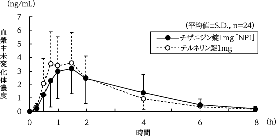 チザニジン錠1mg「NPI」とテルネリン錠1mgを、クロスオーバー法によりそれぞれ3錠(チザニジンとして3mg)健康成人男子に絶食単回経口投与して血漿中未変化体濃度を測定し、得られた薬物動態パラメータ(AUC、Cmax)について分散分析法にて統計解析を行った結果、両剤の生物学的同等性が確認された1)。