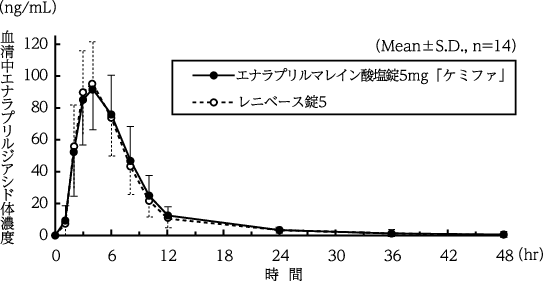 エナラプリルマレイン酸塩錠5mg「ケミファ」とレニベース錠5を、クロスオーバー法によりそれぞれ2錠(エナラプリルマレイン酸塩として10mg)健康成人男子に絶食単回経口投与して血清中活性代謝物エナラプリルジアシド体濃度を測定し、得られた薬物動態パラメータ(AUC、Cmax)について分散分析にて統計解析を行った結果、両剤の生物学的同等性が確認された5)。