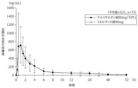 テルミサルタン錠80mg「NPI」とミカルディス錠80mgを、クロスオーバー法によりそれぞれ1錠(テルミサルタンとして80mg)健康成人男子に絶食単回経口投与して血漿中未変化体濃度を測定し、得られた薬物動態パラメータ(AUC、Cmax)について90%信頼区間法にて統計解析を行った結果、log(0.80)~log(1.25)の範囲内であり、両剤の生物学的同等性が確認された10)。