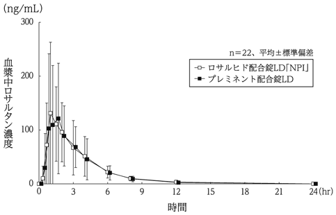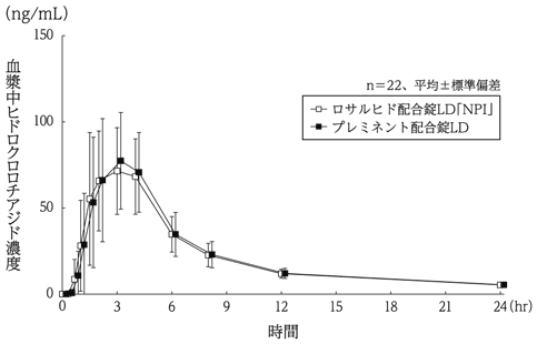 ロサルヒド配合錠HD「NPI」は、「含量が異なる経口固形製剤の生物学的同等性試験ガイドライン」に基づき、ロサルヒド配合錠LD「NPI」を標準製剤としたとき、溶出挙動が同等と判断され、生物学的に同等とみなされた11)。
