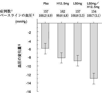 日本人を対象とした二重盲検比較試験において、ロサルタンカリウム/ヒドロクロロチアジド50mg/12.5mgはロサルタンカリウム50mg投与よりも有意に優れた降圧効果が認められた。降圧効果判定採用154例のうち有効(拡張期血圧が90mmHg未満に又は10mmHg以上低下した症例)と判定された症例は112例(73%)であった。なお、8週間時における拡張期血圧の平均変化量は下図のとおりであった。