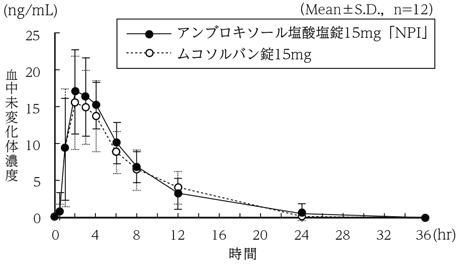 アンブロキソール塩酸塩錠15mg「NPI」とムコソルバン錠15mgを、クロスオーバー法によりそれぞれ1錠(アンブロキソール塩酸塩として15mg)健康成人男子に絶食単回経口投与して血中未変化体濃度を測定し、得られた薬物動態パラメータ(AUC、Cmax)について分散分析による統計解析を行った結果、両剤の生物学的同等性が確認された1)。