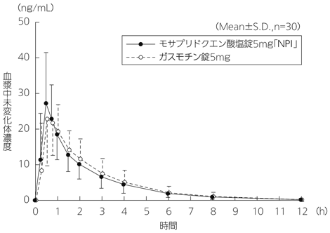モサプリドクエン酸塩錠5mg「NPI」とガスモチン錠5mgを、クロスオーバー法によりそれぞれ1錠(モサプリドクエン酸塩として5mg)健康成人男子に絶食単回経口投与して血漿中未変化体濃度を測定し、得られた薬物動態パラメータ(AUC、Cmax)について90%信頼区間法にて統計解析を行った結果、log(0.80)〜log(1.25)の範囲内であり、両剤の生物学的同等性が確認された3)。