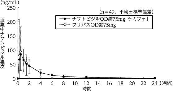 ナフトピジルOD錠75mg「ケミファ」とフリバスOD錠75mgをクロスオーバー法によりそれぞれ1錠(ナフトピジルとして75mg)健康成人男子に絶食単回経口投与(水なしで服用及び水で服用)して血漿中ナフトピジル濃度を測定し、得られた薬物動態パラメータ(AUC、Cmax)について統計解析を行った。水なしで服用した場合は90%信頼区間法にてlog(0.80)~log(1.25)の範囲内であり、両剤の生物学的同等性が確認された。また、水で服用した場合は判定パラメータの対数値の平均値の差がlog(0.90)~log(1.11)の範囲内であり、かつ、溶出試験では溶出挙動が類似していることから両剤の生物学的同等性が確認された2)。