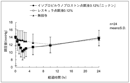 イソプロピルウノプロストン点眼液0.12%「ニッテン」とレスキュラ点眼液0.12%を健康成人男子を対象としてそれぞれ1滴両眼に点眼し、2群(クロスオーバー法)の眼圧値を測定した。各測定時点の眼圧値及び得られたパラメータ(最高眼圧変化量、眼圧値-時間曲線下面積)について統計解析を行った結果、両剤の生物学的同等性が確認された30)。