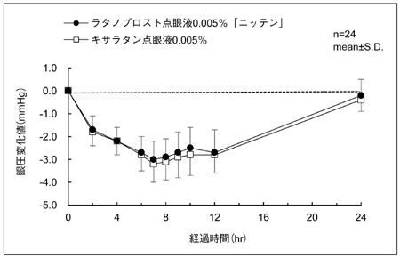 ラタノプロスト点眼液0.005%「ニッテン」とキサラタン点眼液0.005%を健康成人男子を対象としてそれぞれ1滴両眼に点眼し、2群(クロスオーバー法)の眼圧値を測定した。同一被験者の眼圧実測値から投与前の測定値を引いた眼圧変化値及び得られたパラメータ(最高眼圧変化量、眼圧下降-時間曲線下面積)について統計解析を行った結果、両剤の生物学的同等性が確認された15)。