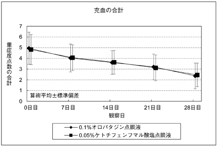 アレルギー性結膜炎患者(247例)を対象に、0.1%オロパタジン点眼液又は0.05%ケトチフェンフマル酸塩点眼液を両眼に1回2滴、1日4回(朝、昼、夕、就寝前)28日間点眼投与したところ、そう痒感及び充血の重症度点数において、0.1%オロパタジン点眼液は0.05%ケトチフェンフマル酸塩点眼液に劣らない有効性を示した。
