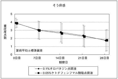 アレルギー性結膜炎患者(247例)を対象に、0.1%オロパタジン点眼液又は0.05%ケトチフェンフマル酸塩点眼液を両眼に1回2滴、1日4回(朝、昼、夕、就寝前)28日間点眼投与したところ、そう痒感及び充血の重症度点数において、0.1%オロパタジン点眼液は0.05%ケトチフェンフマル酸塩点眼液に劣らない有効性を示した。