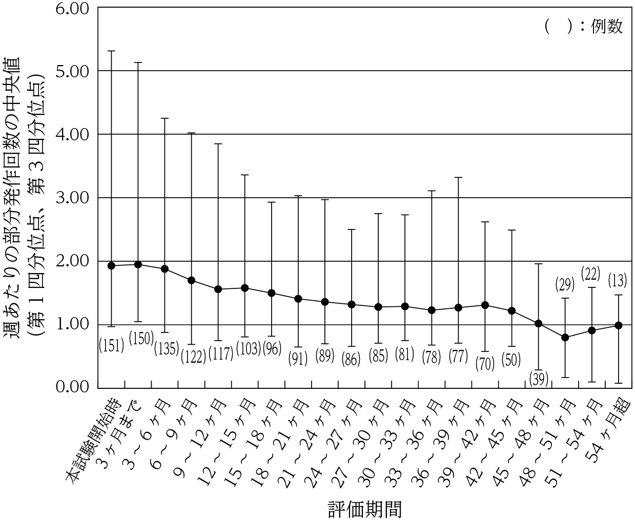 国内第Ⅱ/Ⅲ相試験(成人、併用療法)を完了した患者151例を対象として、レベチラセタム1000~3000mg/日を1日2回に分けて経口投与したときの部分発作回数は以下のとおりであった35),36),37) 。本試験に参加した被験者のうち、76例がその後計画された継続試験に移行し本試験を終了した(24~36ヵ月で1例、36~48ヵ月で47例、48ヵ月以降で28例)。
