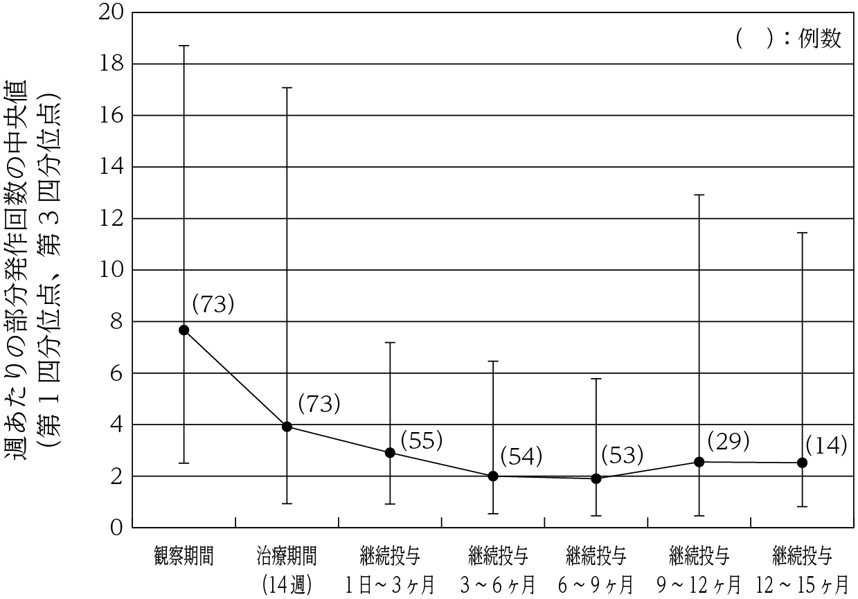 既存の抗てんかん薬で十分な発作抑制効果が得られない部分発作を有する4歳以上16歳未満の小児てんかん患者73例を対象として、レベチラセタム40又は60mg/kg/日(体重50kg以上は2000又は3000mg/日)を1日2回に分けて14週間経口投与(既存の抗てんかん薬との併用)したとき、主要評価項目である観察期間からの週あたりの部分発作回数減少率の中央値(95%信頼区間)は、43.21%(26.19%,52.14%)であり、発作頻度の減少が認められた。また、小児てんかん患者55例に14週以降もレベチラセタム20~60mg/kg/日(体重50kg以上は1000~3000mg/日)を1日2回に分けて継続投与したときの部分発作回数は以下のとおりであった38) 。
