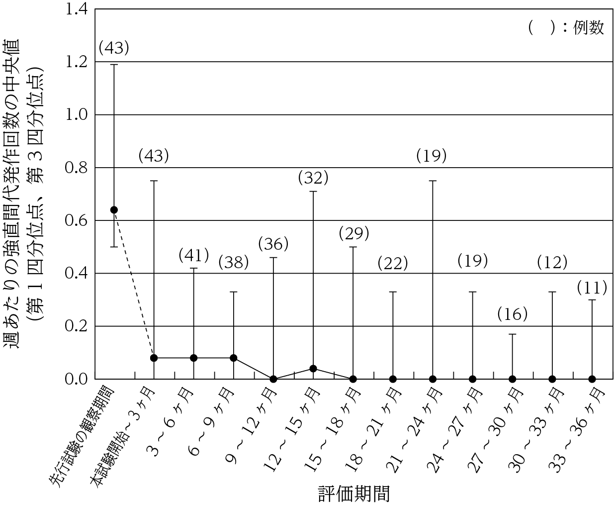国際共同第Ⅲ相試験若しくは小児国内第Ⅲ相試験を完了、又は国際共同第Ⅲ相試験を効果不十分のため投与20週以降に中止した日本人患者44例を対象として、成人(16歳以上)ではレベチラセタム1000~3000mg/日、小児ではレベチラセタム20~60mg/kg/日(体重50kg以上は1000~3000mg/日)を経口投与したとき、強直間代発作回数は以下のとおりであった41),42) 。