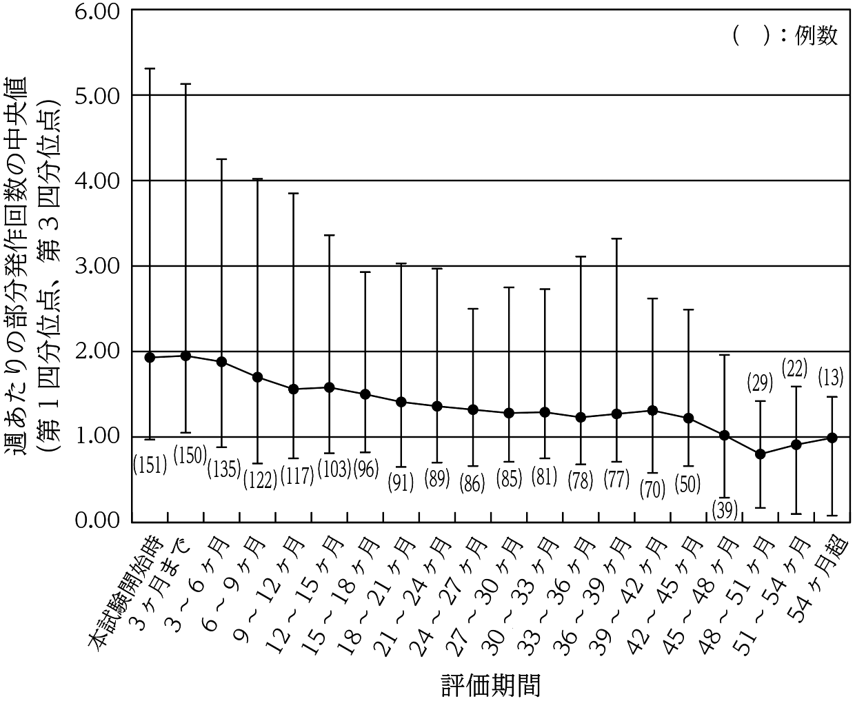 国内第Ⅱ/Ⅲ相試験(成人、併用療法)を完了した患者151例を対象として、レベチラセタム1000~3000mg/日を1日2回に分けて経口投与したときの部分発作回数は以下のとおりであった34),35),36) 。本試験に参加した被験者のうち、76例がその後計画された継続試験に移行し本試験を終了した(24~36ヵ月で1例、36~48ヵ月で47例、48ヵ月以降で28例)。