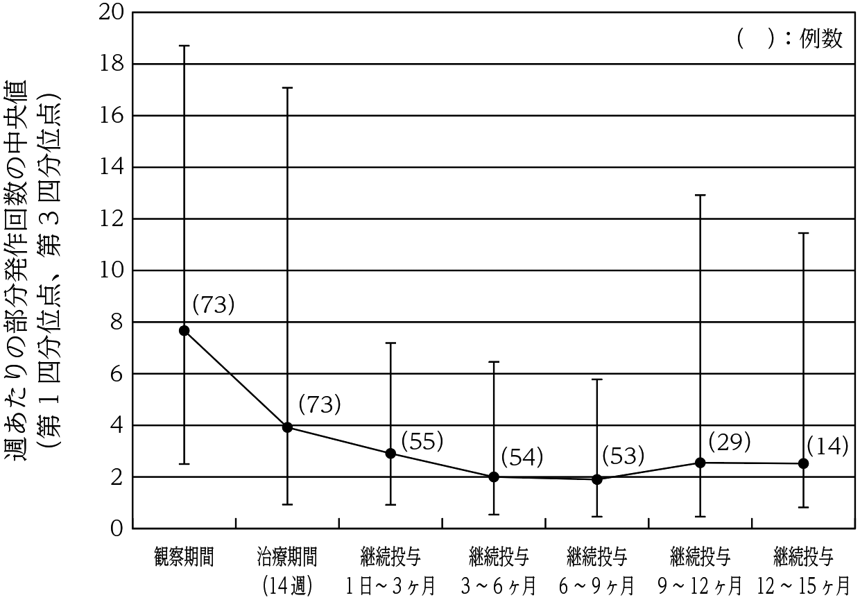 既存の抗てんかん薬で十分な発作抑制効果が得られない部分発作を有する4歳以上16歳未満の小児てんかん患者73例を対象として、レベチラセタム40又は60mg/kg/日(体重50kg以上は2000又は3000mg/日)を1日2回に分けて14週間経口投与(既存の抗てんかん薬との併用)したとき、主要評価項目である観察期間からの週あたりの部分発作回数減少率の中央値(95%信頼区間)は、43.21%(26.19%,52.14%)であり、発作頻度の減少が認められた。また、小児てんかん患者55例に14週以降もレベチラセタム20~60mg/kg/日(体重50kg以上は1000~3000mg/日)を1日2回に分けて継続投与したときの部分発作回数は以下のとおりであった37) 。