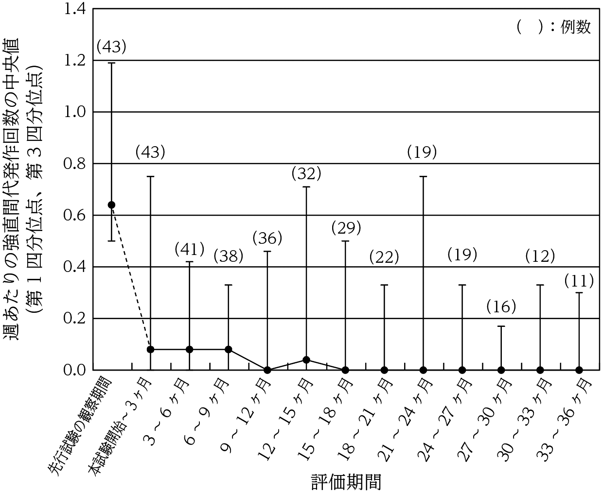 国際共同第Ⅲ相試験若しくは小児国内第Ⅲ相試験を完了、又は国際共同第Ⅲ相試験を効果不十分のため投与20週以降に中止した日本人患者44例を対象として、成人(16歳以上)ではレベチラセタム1000~3000mg/日、小児ではレベチラセタム20~60mg/kg/日(体重50kg以上は1000~3000mg/日)を経口投与したとき、強直間代発作回数は以下のとおりであった40),41) 。
