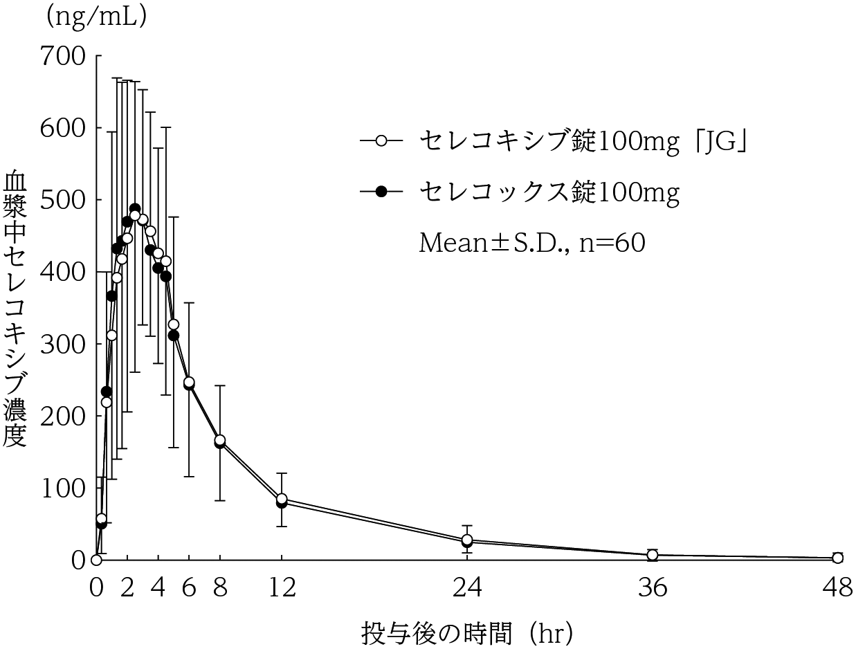 健康成人(投与期間:2週間)を対象とする実薬対照試験の結果、胃・十二指腸の潰瘍発現率(内視鏡所見)はセレコキシブ100mg1日2回投与で1.4%(1/74)、対照薬(COX-2に対して選択性の低い非ステロイド性消炎・鎮痛剤)で27.6%(21/76)、プラセボで2.7%(1/37)であった47) 。セレコキシブ群の胃・十二指腸の潰瘍以外で2例以上の副作用の発現率は、びらん性胃炎10.5%(8/76)、腹部不快感2.6%(2/76)、上腹部痛2.6%(2/76)、胃炎2.6%(2/76)、口内炎2.6%(2/76)であった。