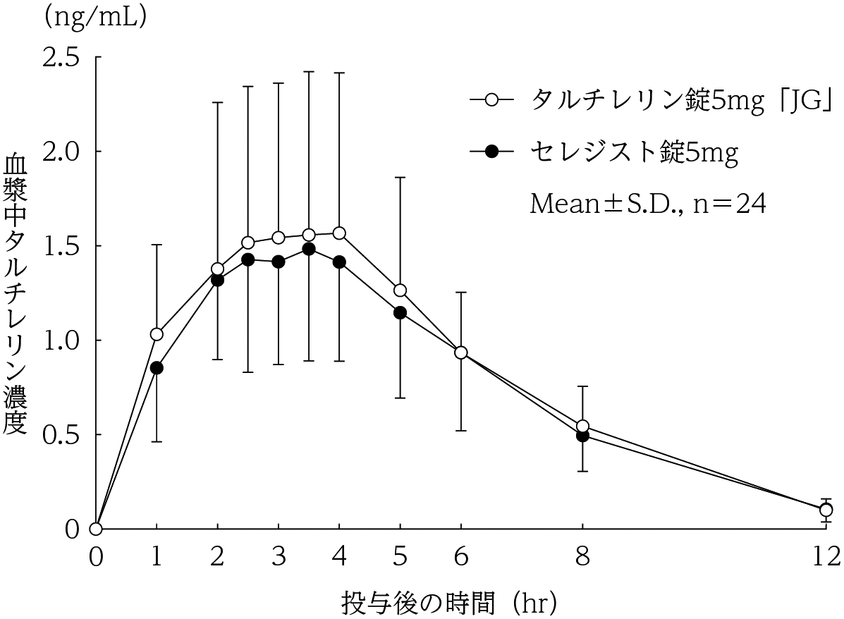 タルチレリン錠5mg「JG」とセレジスト錠5mgを、クロスオーバー法によりそれぞれ1錠(タルチレリン水和物として5mg)健康成人男子に絶食単回経口投与して血漿中未変化体濃度を測定し、得られた薬物動態パラメータ(AUC、Cmax)について90%信頼区間法にて統計解析を行った結果、log(0.80)〜log(1.25)の範囲内であり、両剤の生物学的同等性が確認された3) 。