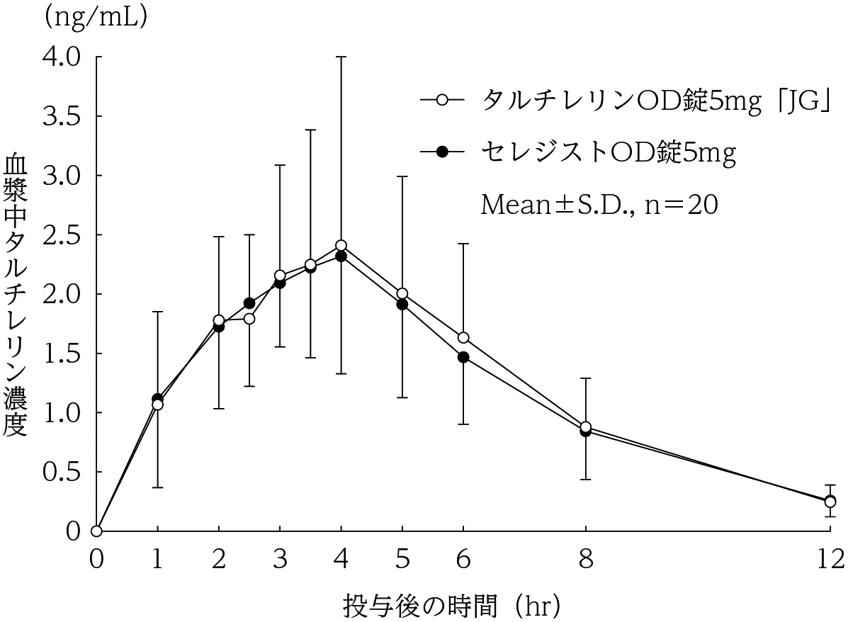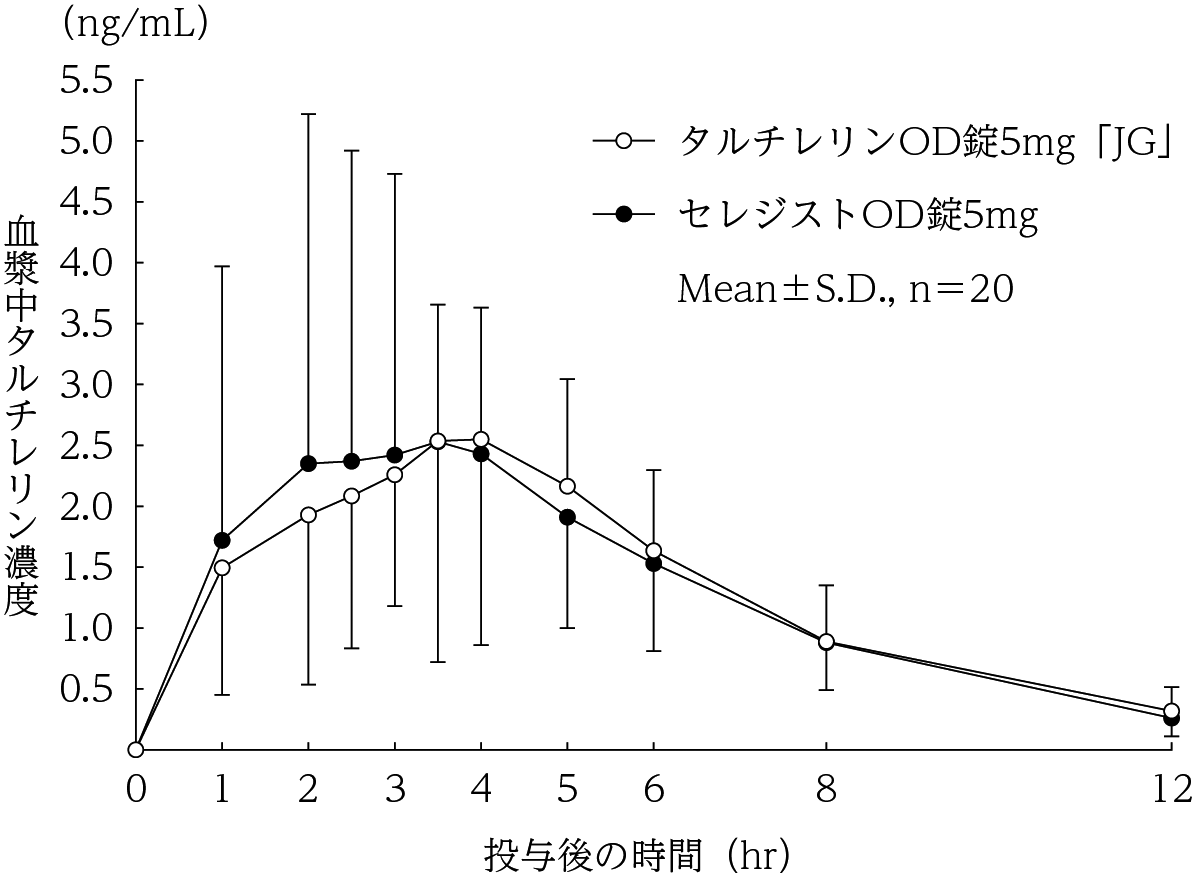 タルチレリンOD錠5mg「JG」とセレジストOD錠5mgを、クロスオーバー法によりそれぞれ1錠(タルチレリン水和物として5mg)健康成人男子に水150mLと共に絶食単回経口投与して血漿中未変化体濃度を測定し、得られた薬物動態パラメータ(AUC、Cmax)について統計解析を行った結果、両剤の生物学的同等性が確認された4) 。