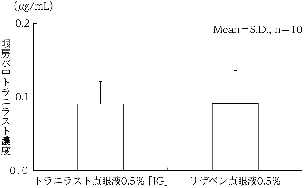 トラニラスト点眼液0.5%「JG」とリザベン点眼液0.5%について、ウサギ眼に点眼し、点眼後3時間に眼房水を採取し、眼房水中トラニラスト濃度を測定した。その結果、両剤の点眼後3時間の眼房水中トラニラスト濃度に有意な差は認められず、両剤の生物学的同等性が確認された2) 。