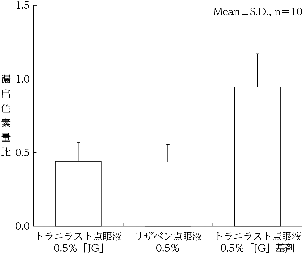抗卵白アルブミン(ovalbumin:OVA)血清により感作された実験的モルモット結膜炎モデルに対して、トラニラスト点眼液0.5%「JG」とリザベン点眼液0.5%を点眼投与後に1%エバンスブルーと1%OVA溶液の等量混合液によりアレルギー反応を誘発し、眼瞼結膜からの漏出色素量を測定し、生理食塩液を点眼投与した眼での漏出色素量との比率から血管透過性亢進(アレルギー反応)抑制作用を評価した。その結果、両剤ともトラニラスト点眼液0.5%「JG」基剤に対し有意に色素漏出を抑制し、また、両剤間では有意な差は認められず、両剤の生物学的同等性が確認された2) 。