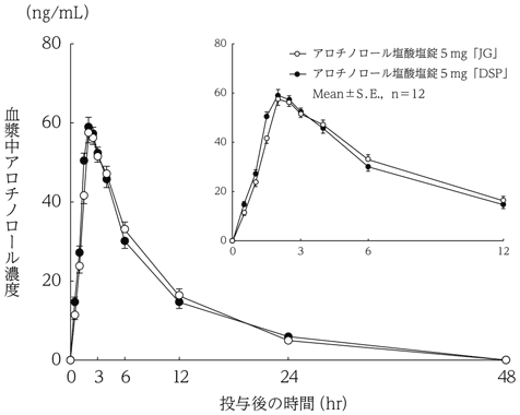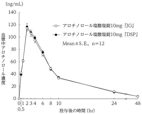 アロチノロール塩酸塩錠5mg「JG」とアロチノロール塩酸塩錠5mg「DSP」を、クロスオーバー法によりそれぞれ1錠(アロチノロール塩酸塩として5mg)健康成人男性に絶食単回経口投与して血漿中未変化体濃度を測定し、得られた薬物動態パラメータ(AUC、Cmax)について統計解析を行った結果、両剤の生物学的同等性が確認された2)。