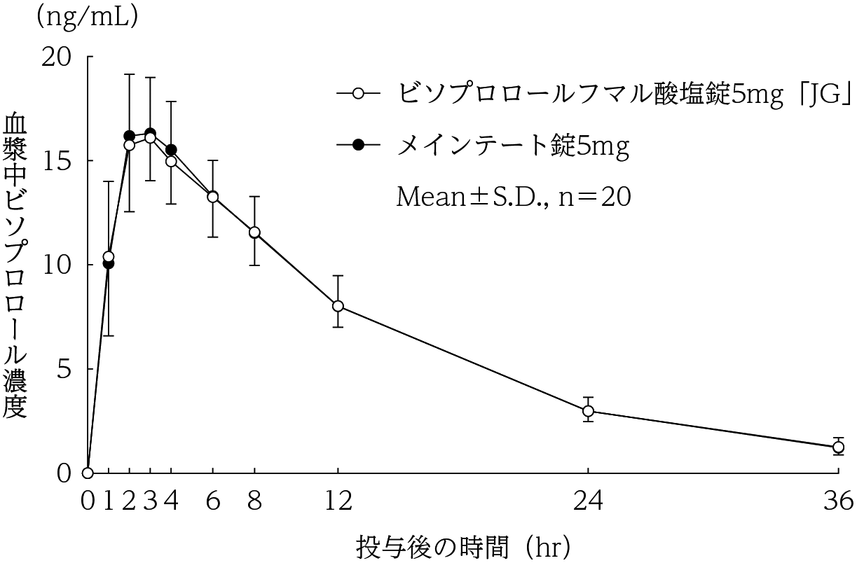 ビソプロロールフマル酸塩錠2.5mg「JG」は、「含量が異なる経口固形製剤の生物学的同等性試験ガイドライン(平成24年2月29日 薬食審査発0229第10号 別紙2)」に基づき、ビソプロロールフマル酸塩錠5mg「JG」を標準製剤とした溶出試験の結果、溶出挙動は同等と判定され、生物学的に同等とみなされた10) 。