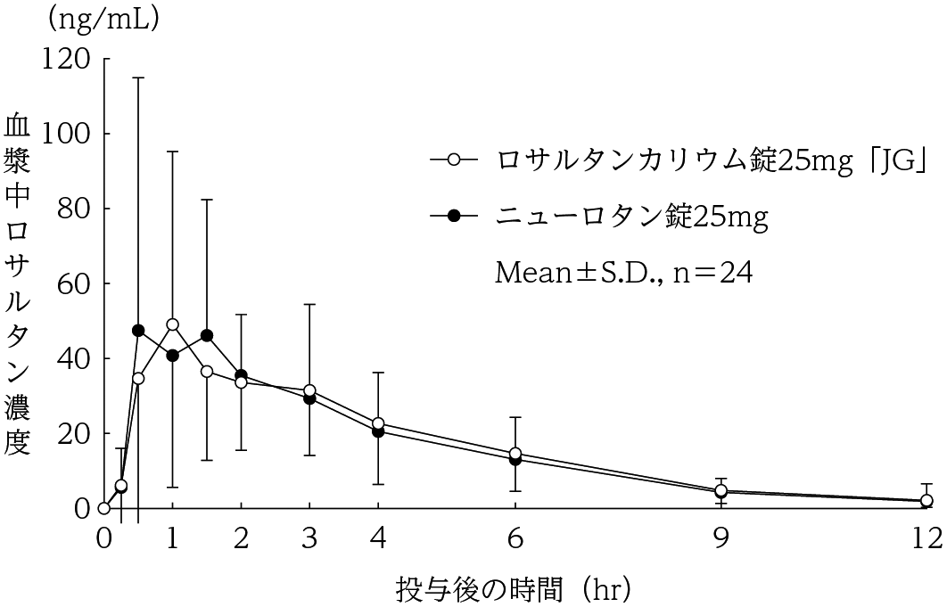 ロサルタンカリウム錠25mg「JG」とニューロタン錠25mgを、クロスオーバー法によりそれぞれ1錠(ロサルタンカリウムとして25mg)健康成人男子に絶食単回経口投与して血漿中未変化体濃度を測定し、得られた薬物動態パラメータ(AUC、Cmax)について統計解析を行った結果、両剤の生物学的同等性が確認された7) 。