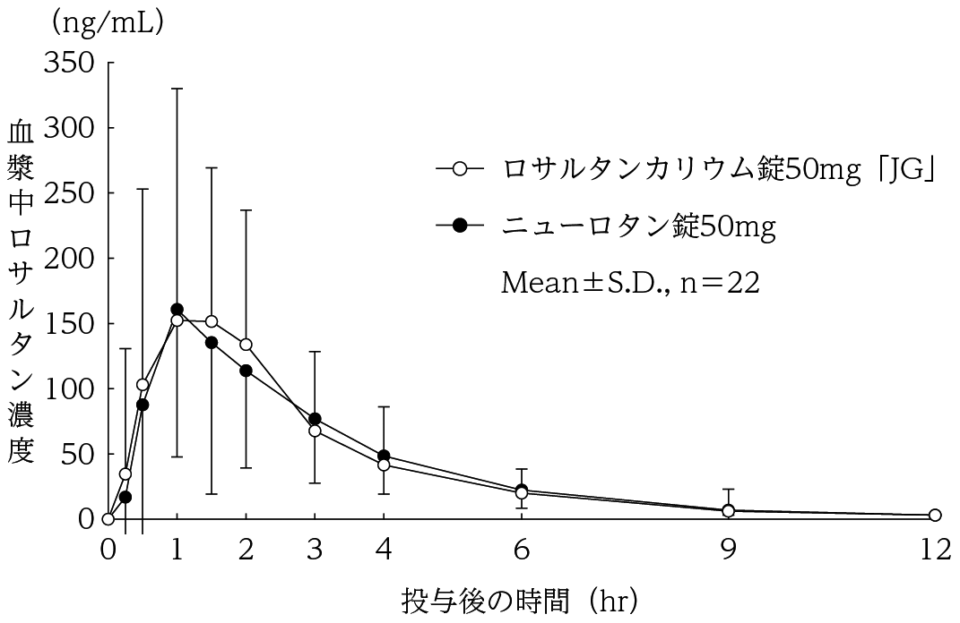 ロサルタンカリウム錠50mg「JG」とニューロタン錠50mgを、クロスオーバー法によりそれぞれ1錠(ロサルタンカリウムとして50mg)健康成人男子に絶食単回経口投与して血漿中未変化体濃度を測定し、得られた薬物動態パラメータ(AUC、Cmax)について統計解析を行った結果、両剤の生物学的同等性が確認された8) 。