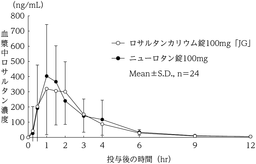 ロサルタンカリウム錠100mg「JG」とニューロタン錠100mgを、クロスオーバー法によりそれぞれ1錠(ロサルタンカリウムとして100mg)健康成人男子に絶食単回経口投与して血漿中未変化体濃度を測定し、得られた薬物動態パラメータ(AUC、Cmax)について統計解析を行った結果、両剤の生物学的同等性が確認された9) 。