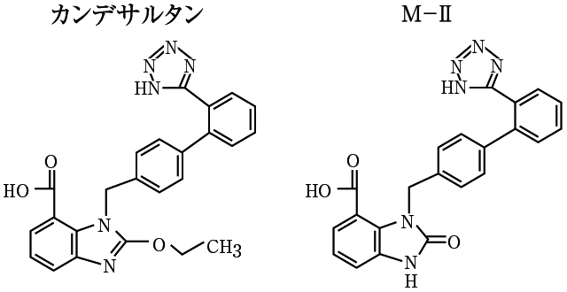 カンデサルタン シレキセチルはカルボキシルエステラーゼにより活性代謝物カンデサルタンに代謝され、さらに一部がCYP2C9により非活性代謝物M-Ⅱに代謝されるが、本態性高血圧症患者にカンデサルタン シレキセチルを投与したときのM-Ⅱの血中濃度及び尿中排泄率はカンデサルタンの血中濃度及び尿中排泄率に比べ低く、CYP2C9の遺伝的多型によるカンデサルタンの血中濃度への影響は少ないと考えられる5) 。また、カンデサルタンはCYP1A1、1A2、2A6、2B6、2C8、2C9、2C19、2D6、2E1、3A4の代謝活性を阻害しない10) (in vitro)。