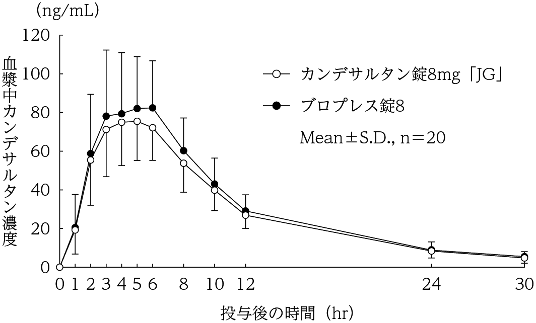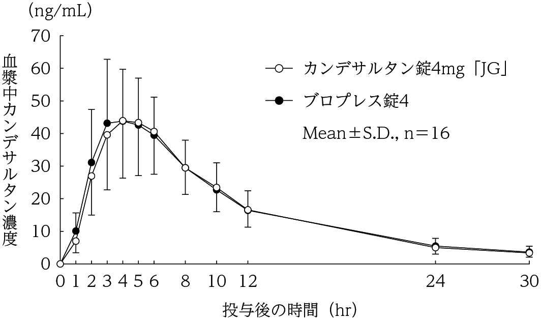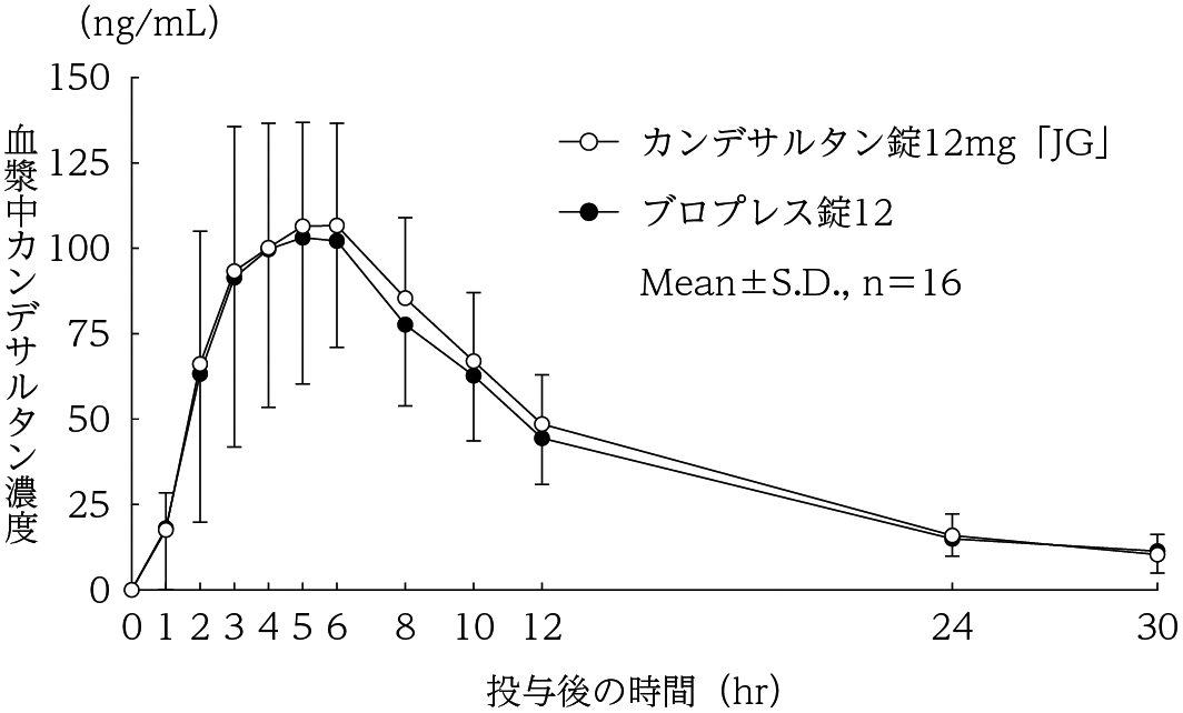 カンデサルタン錠2mg「JG」は、「含量が異なる経口固形製剤の生物学的同等性試験ガイドライン(平成24年2月29日 薬食審査発0229第10号 別紙2)」に基づき、カンデサルタン錠4mg「JG」を標準製剤とした溶出試験の結果、溶出挙動は同等と判定され、生物学的に同等とみなされた16) 。