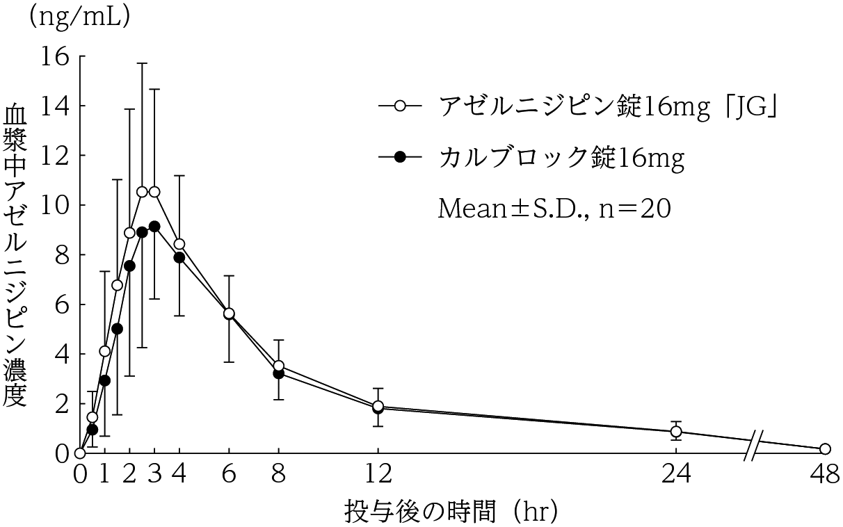 健康な成人男性6例にアゼルニジピン8mgを1日1回7日間連続経口投与したところ、最高血漿中濃度に到達する時間は2~3時間であり、半減期は19~23時間であった。投与後24時間の血漿中濃度は、投与2日目からほぼ一定の値を示し、速やかに定常状態に達した1) 。