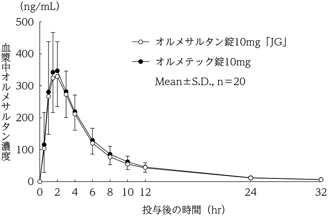 オルメサルタン錠10mg「JG」とオルメテック錠10mgを、クロスオーバー法によりそれぞれ1錠(オルメサルタン メドキソミルとして10mg)健康成人男性に絶食単回経口投与して血漿中活性代謝物(オルメサルタン)濃度を測定し、得られた薬物動態パラメータ(AUC、Cmax)について90%信頼区間法にて統計解析を行った結果、log(0.80)~log(1.25)の範囲内であり、両剤の生物学的同等性が確認された7) 。