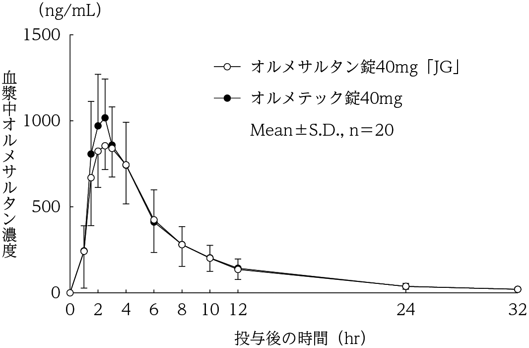 オルメサルタン錠40mg「JG」とオルメテック錠40mgを、クロスオーバー法によりそれぞれ1錠(オルメサルタン メドキソミルとして40mg)健康成人男性に絶食単回経口投与して血漿中活性代謝物(オルメサルタン)濃度を測定し、得られた薬物動態パラメータ(AUC、Cmax)について90%信頼区間法にて統計解析を行った結果、log(0.80)~log(1.25)の範囲内であり、両剤の生物学的同等性が確認された8) 。