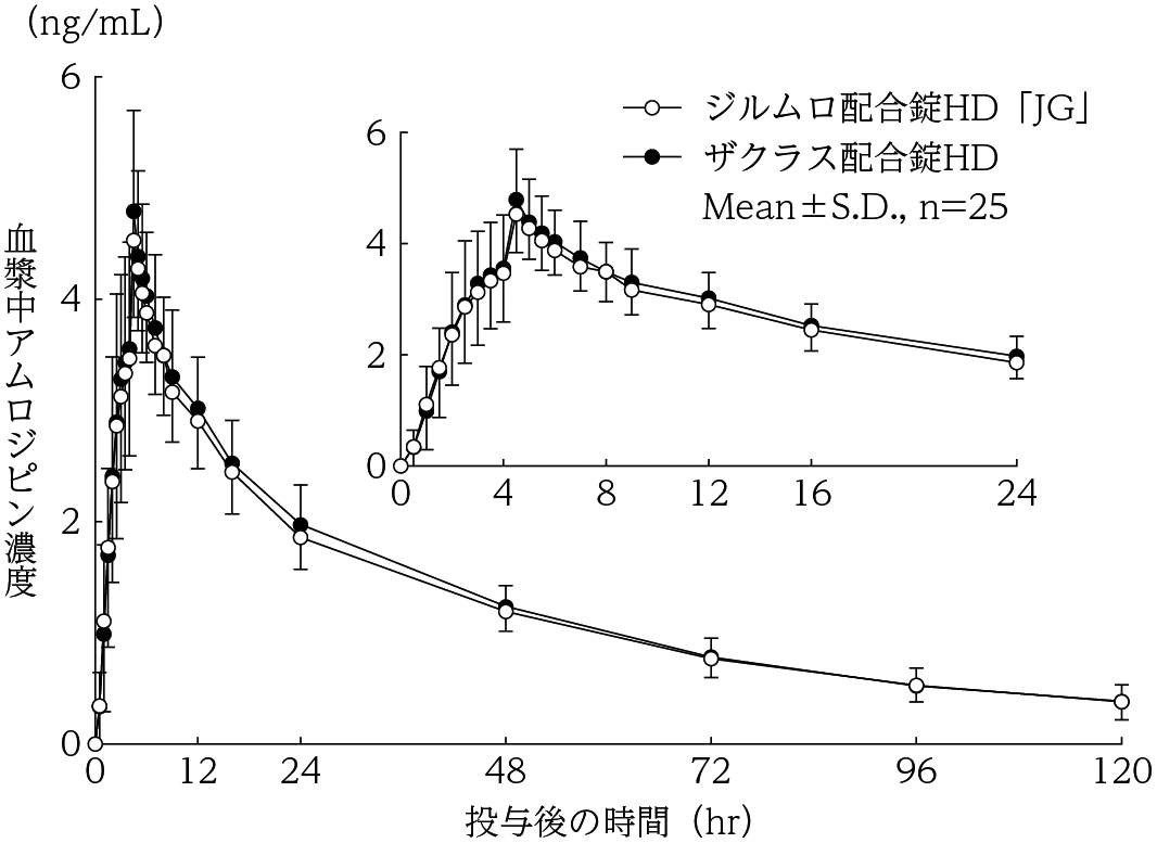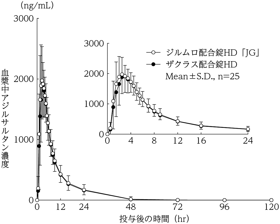 ジルムロ配合錠HD「JG」とザクラス配合錠HDを、クロスオーバー法によりそれぞれ1錠(アジルサルタン、アムロジピンとしてそれぞれ20mg、5mg)健康成人男性に絶食単回経口投与して血漿中未変化体濃度を測定し、得られた薬物動態パラメータ(AUC、Cmax)について90%信頼区間法にて統計解析を行った結果、log(0.80)~log(1.25)の範囲内であり、両剤の生物学的同等性が確認された8) 。