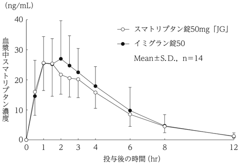 スマトリプタン錠50mg「JG」とイミグラン錠50を、クロスオーバー法によりそれぞれ1錠(スマトリプタンとして50mg)健康成人男性に絶食単回経口投与して血漿中未変化体濃度を測定し、得られた薬物動態パラメータ(AUC、Cmax)について90%信頼区間法にて統計解析を行った結果、log(0.80)~log(1.25)の範囲内であり、両剤の生物学的同等性が確認された5)。