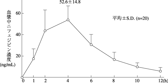 健康成人に本剤(ニフェジピンとして10mg)を食後経口投与したときのニフェジピン血漿中濃度は、図のとおりであり、緩徐な立ちあがりと持続性が認められた5)。
