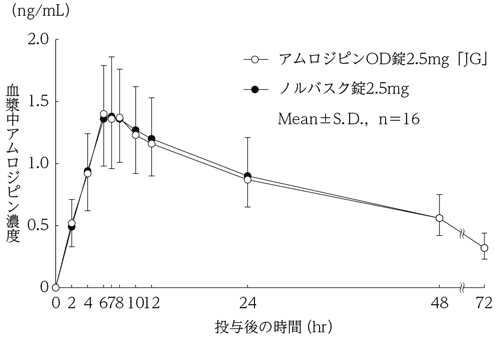 アムロジピンOD錠2.5mg「JG」とノルバスク錠2.5mgを、クロスオーバー法によりそれぞれ1錠(アムロジピンとして2.5mg)健康成人男性に水150mLと共に絶食単回経口投与して血漿中未変化体濃度を測定し、得られた薬物動態パラメータ(AUC、Cmax)について90%信頼区間法にて統計解析を行った結果、log(0.80)~log(1.25)の範囲内であり、両剤の生物学的同等性が確認された8)。