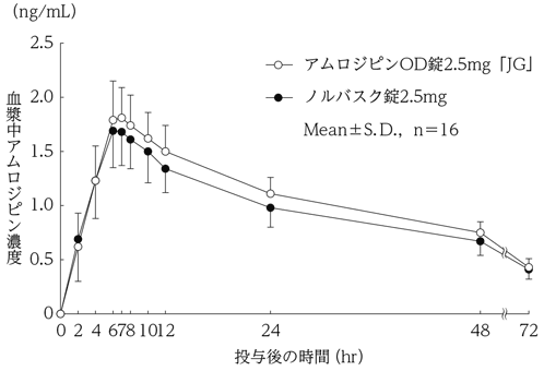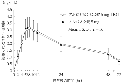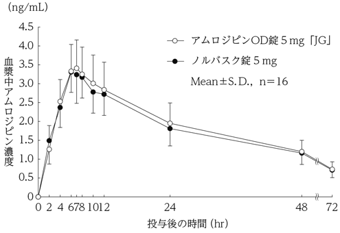 アムロジピンOD錠5mg「JG」とノルバスク錠5mgを、クロスオーバー法によりそれぞれ1錠(アムロジピンとして5mg)健康成人男性にアムロジピンOD錠5mg「JG」は水なしでノルバスク錠5mgは水150mLと共に絶食単回経口投与して血漿中未変化体濃度を測定し、得られた薬物動態パラメータ(AUC、Cmax)について90%信頼区間法にて統計解析を行った結果、log(0.80)~log(1.25)の範囲内であり、両剤の生物学的同等性が確認された9)。