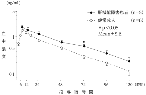 成人肝硬変患者(Child分類A、B)5例にアムロジピンとして2.5mgを単回投与した場合の血中濃度推移並びに薬物動態パラメータは図及び表の通りである。健康成人に比し、投与72時間後の血中濃度が有意に上昇し、T1/2、AUCはやや高値を示したが有意差は認められなかった13)。