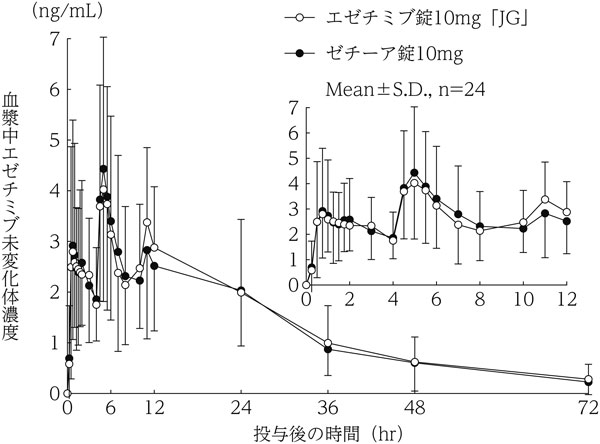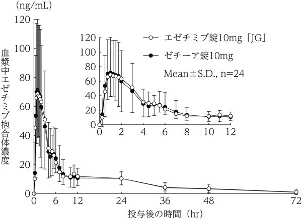 エゼチミブ錠10mg「JG」とゼチーア錠10mgを、クロスオーバー法によりそれぞれ1錠(エゼチミブとして10mg)健康成人男性に絶食単回経口投与して血漿中エゼチミブ抱合体濃度及び血漿中エゼチミブ未変化体濃度を測定し、得られた薬物動態パラメータ(AUC、Cmax)について90%信頼区間法にて統計解析を行った結果、log(0.80)~log(1.25)の範囲内であり、両剤の生物学的同等性が確認された8)。