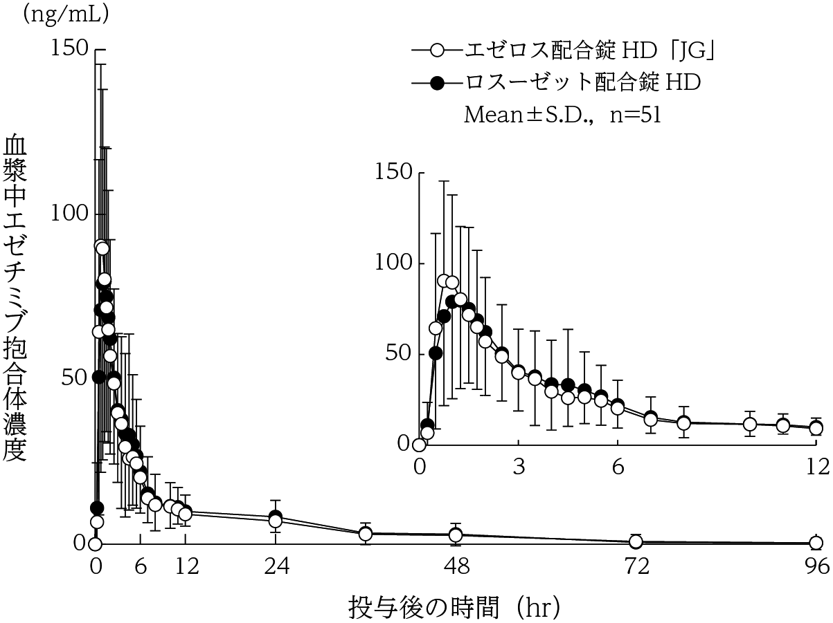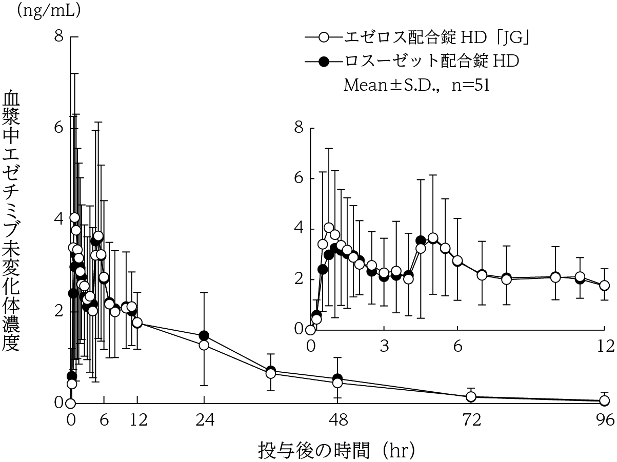 エゼチミブ10mgとロスバスタチン2.5mg併用投与71例中7例(9.9%)、またエゼチミブ10mgとロスバスタチン5mg併用投与72例中3例(4.2%)に臨床検査値の異常を含む副作用が認められた。主な副作用はALT増加で、いずれの群においても2例(2.8%)であった50) 。