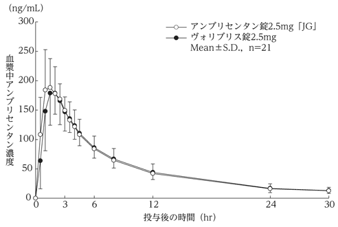 アンブリセンタン錠2.5mg「JG」とヴォリブリス錠2.5mgを、クロスオーバー法によりそれぞれ1錠(アンブリセンタンとして2.5mg)健康成人男性に空腹時単回経口投与して血漿中アンブリセンタン濃度を測定し、得られた薬物動態パラメータ(AUC、Cmax)について90%信頼区間法にて統計解析を行った結果、log(0.80)~log(1.25)の範囲内であり、両剤の生物学的同等性が確認された4)。