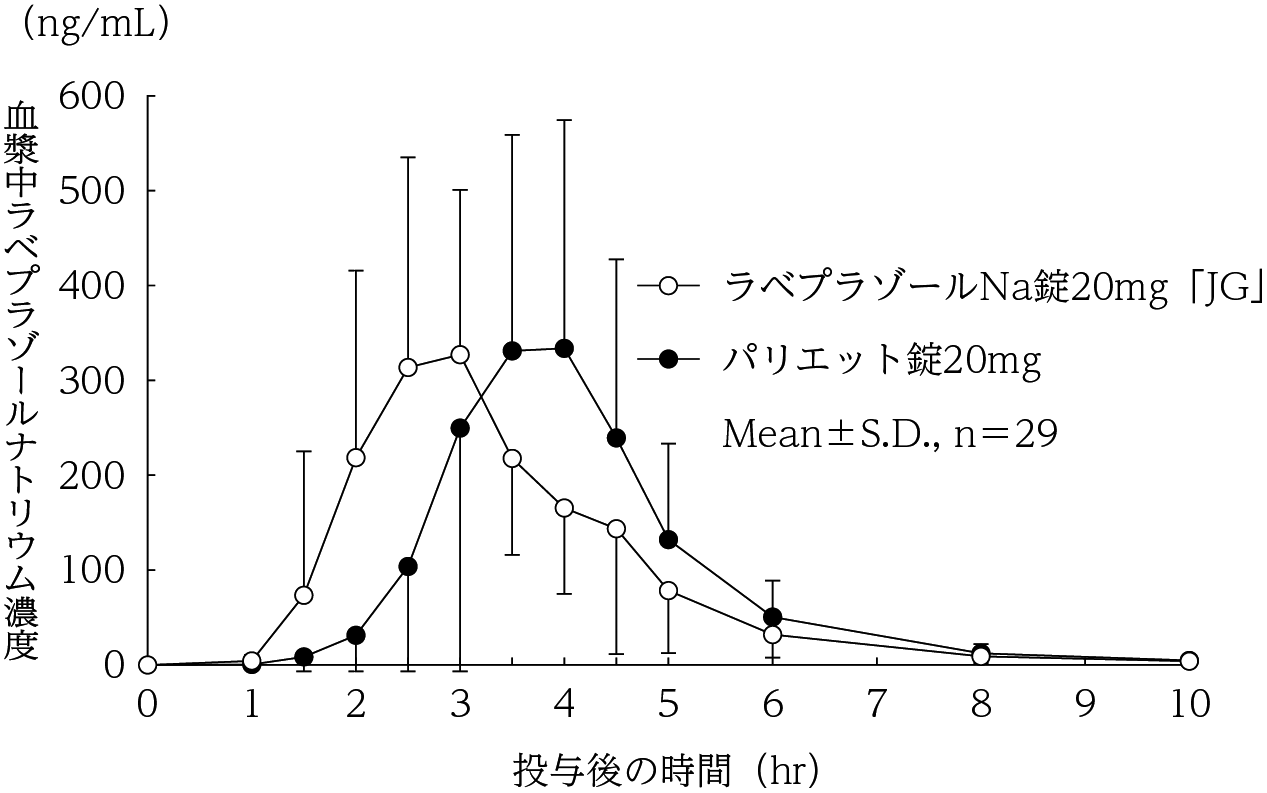 ラベプラゾールNa錠20mg「JG」とパリエット錠20mgを、クロスオーバー法によりそれぞれ1錠(ラベプラゾールナトリウムとして20mg)健康成人男子に絶食単回経口投与して血漿中未変化体濃度を測定し、得られた薬物動態パラメータ(AUC、Cmax)について90%信頼区間法にて統計解析を行った結果、log(0.80)~log(1.25)の範囲内であり、両剤の生物学的同等性が確認された3) 。