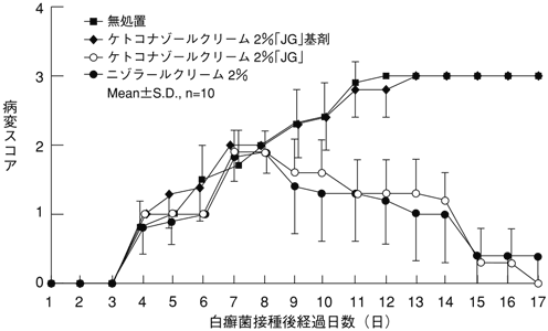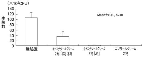 モルモット背部のTrichophyton mentagrophytes感染に対し、ケトコナゾールクリーム2%「JG」は無処置群及び基剤群に比較して有意な治療効果を示した。ニゾラールクリーム2%との比較においては、いずれも両剤間に有意差は認められず、両剤の生物学的同等性が確認された13)。モルモット背部のCandida albicans感染に対しても同様にケトコナゾールクリーム2%「JG」は無処置群及び基剤群に比較して有意な治療効果を示し、また、ニゾラールクリーム2%との有意差は認められず生物学的同等性が確認された13)。