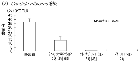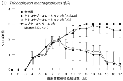モルモット背部のTrichophyton mentagrophytes感染に対し、ケトコナゾールローション2%「JG」は無処置群及び基剤群に比較して有意な治療効果を示した。ニゾラールクリーム2%との比較においては、いずれも両剤間に有意差は認められず、両剤の生物学的同等性が確認された7)。モルモット背部のCandida albicans感染に対しても同様にケトコナゾールローション2%「JG」は無処置群及び基剤群に比較して有意な治療効果を示し、また、ニゾラールローション2%との有意差は認められず生物学的同等性が確認された7)。