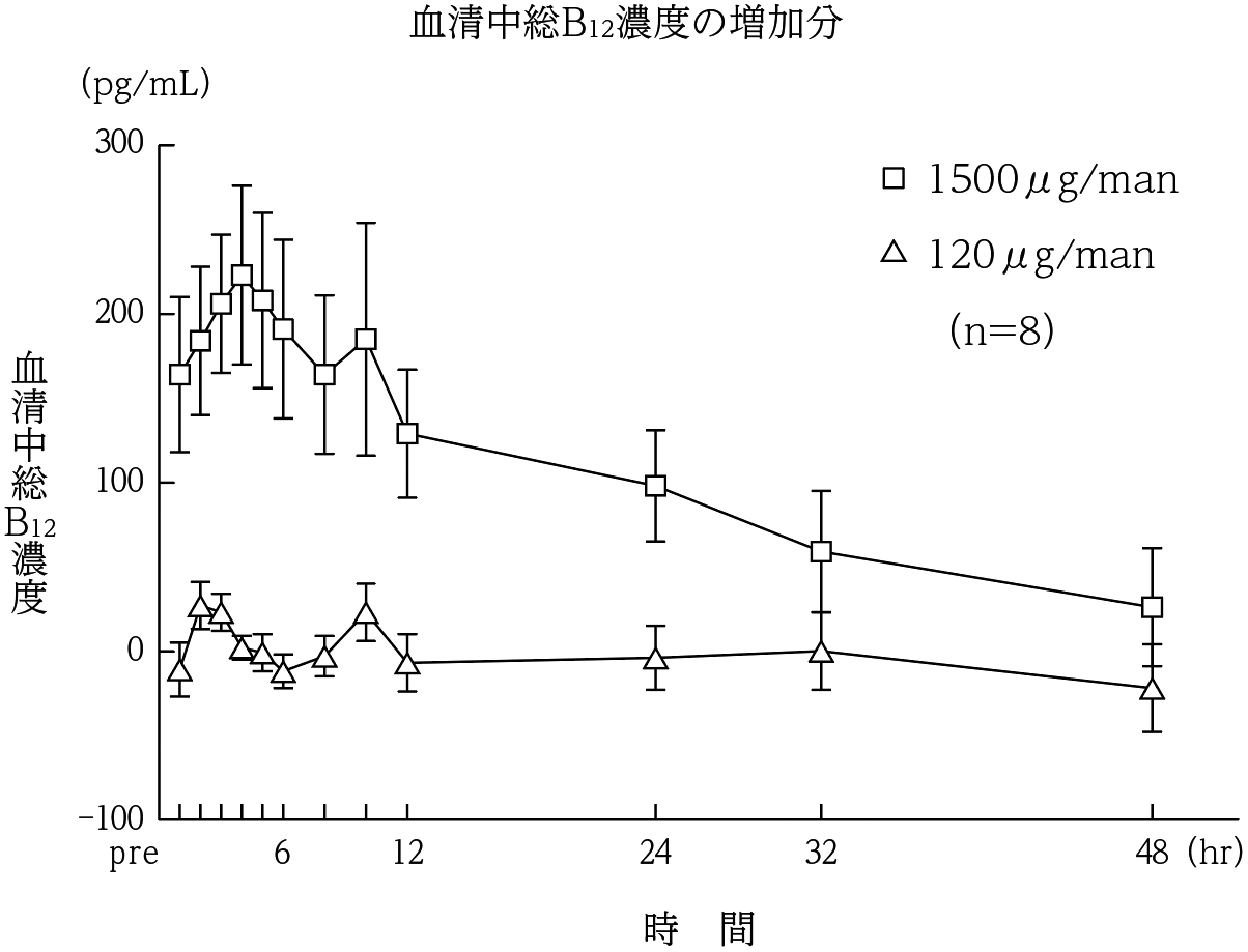 健康成人男子に1,500μgを12週間反復経口投与し、投与中止後4週間の血清中総B12量の変動率を検討した。投与4週間で投与前値の約2倍に達し、以後も漸増し、12週後には約2.8倍を示した。投与中止4週後でも投与前値の約1.8倍を示した2) 。