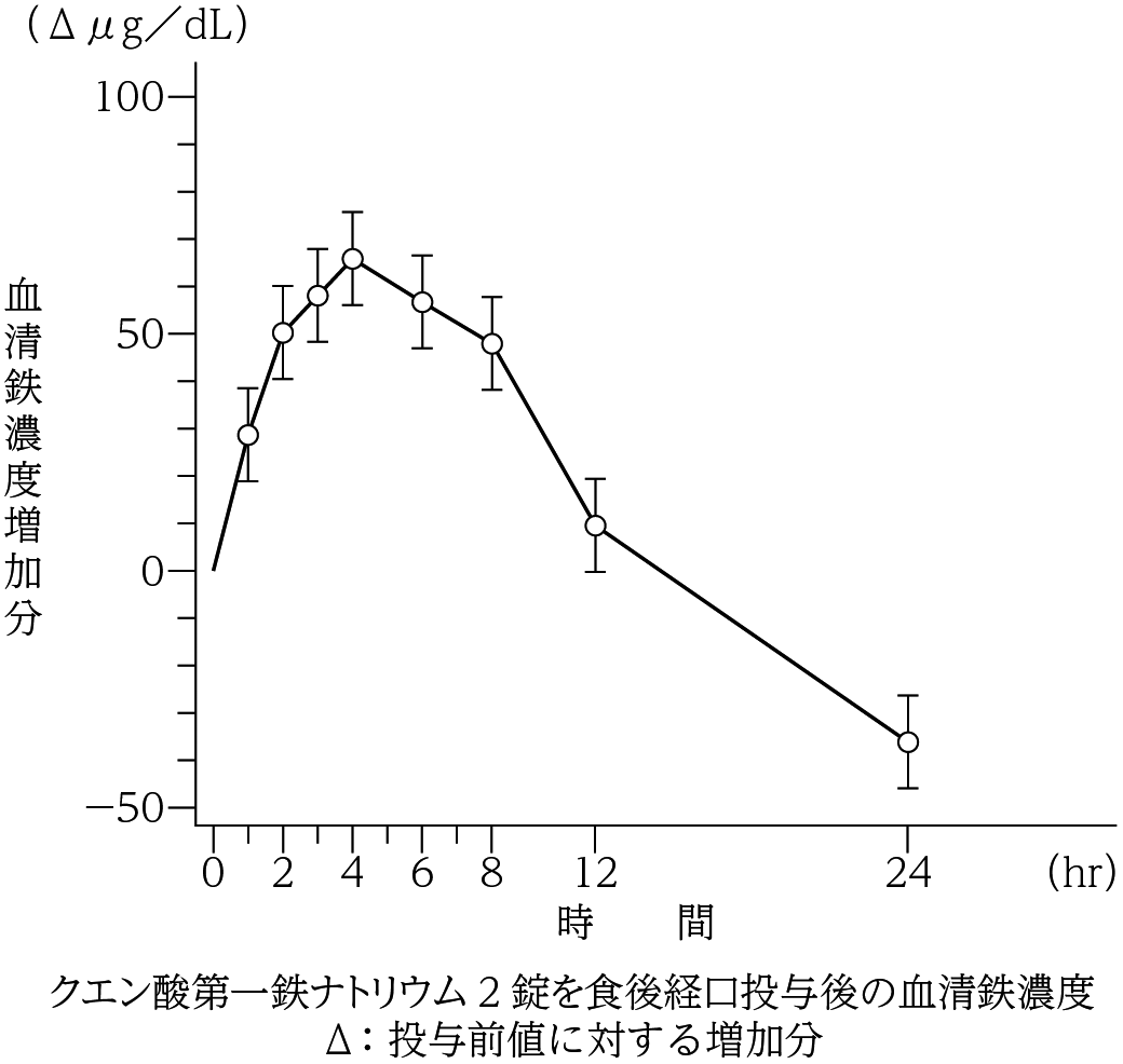 健康成人男子18名に、クエン酸第一鉄ナトリウム2錠(鉄として100mg)を食後単回経口投与した時の血清鉄の推移は投与1時間後から上昇がみられ、3~4時間後にピークに達し、12時間後に投与前値に復した3) 。