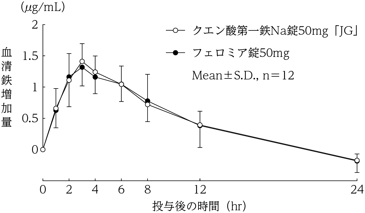 クエン酸第一鉄Na錠50mg「JG」とフェロミア錠50mgを、クロスオーバー法によりそれぞれ2錠(鉄として100mg)健康成人男子に絶食単回経口投与して血清鉄濃度を測定し投与後の血清鉄増加量を求めた。得られた薬物動態パラメータ(AUC、Cmax)について統計解析を行った結果、両剤の生物学的同等性が確認された4) 。[AUC:血清鉄増加量-時間曲線下面積、Cmax:最高血清鉄増加量]