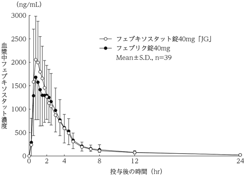 健康成人男性6例に、フェブキソスタットとして40mgを朝食後に1日1回7日間反復経口投与したとき、血漿中フェブキソスタット濃度は投与開始後3日で定常状態に達し、反復投与による蓄積性は認められなかった6)。